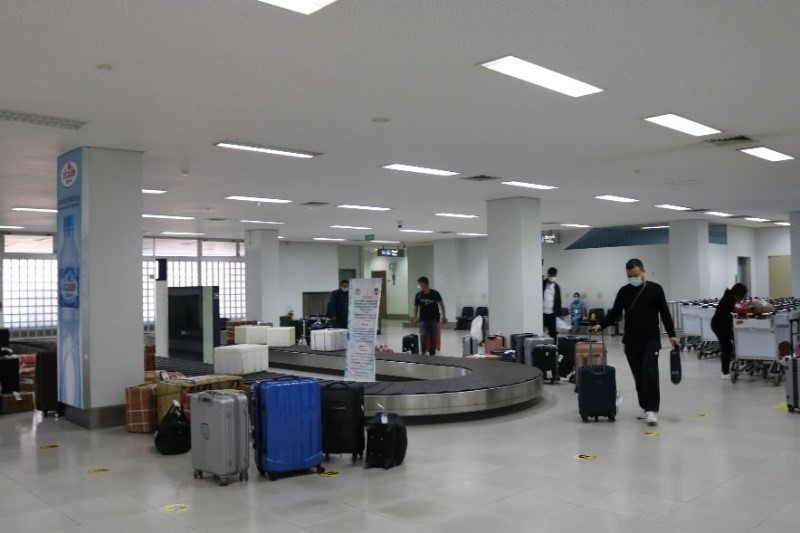 Passengers queue at a counter inside the terminal to buy bus tickets as designated bus companies are operating the services that will take them to their quarantine hotels at a fee of LAK 50,000 each.